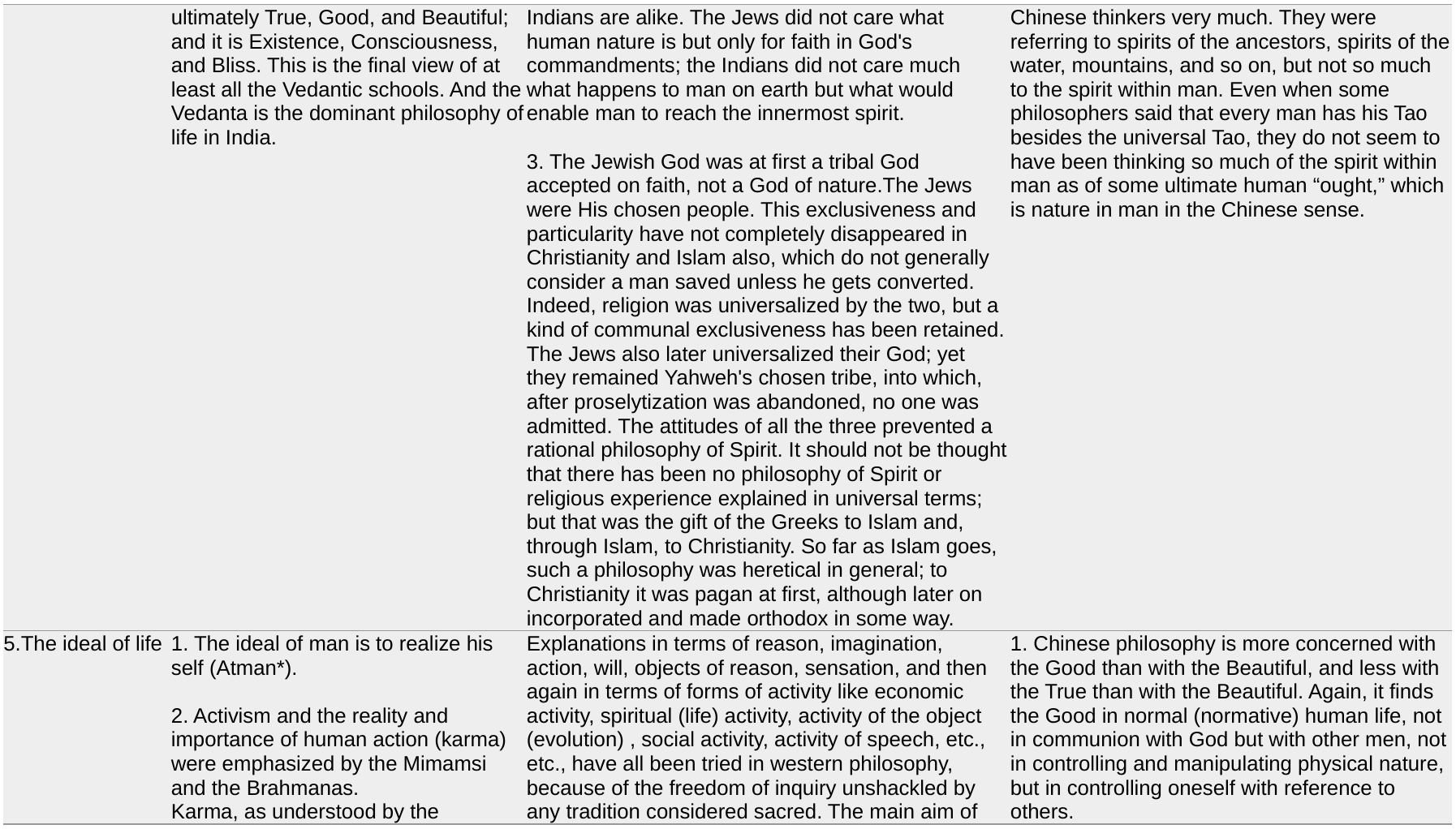 Let us pick up where we left off comparative philosophy (pointing towards a synthetic world philosophy). I have made a table giving a quick comparative analysis (using specific parameters such as epistemology, metaphysics, Life's ideal, man's ultimate nature, civilization and cultures, evolution etc) of the three main philosophical traditions.