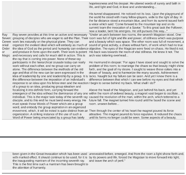 Today we summarize in the next table, statements covering the seven rays methods of the law of service (3rd law of Soul) and the direction of law of repulse to the psychological problem of Desire (4th law of soul) , from the volume 'Esoteric Psychology II by Djwal Khul and Alice Bailey'.