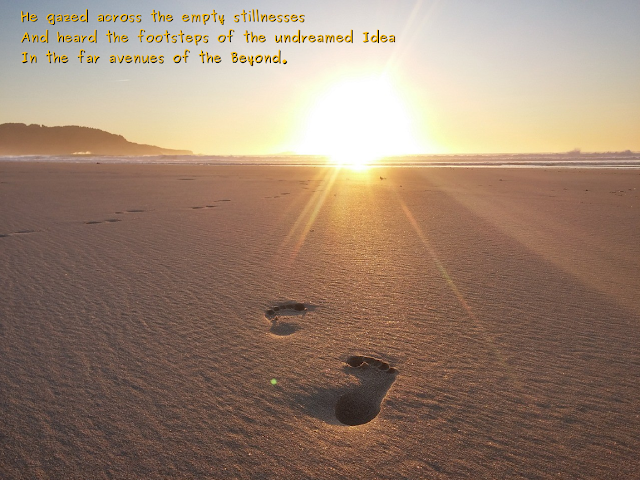 From the mystic spaces where Ashwapati resided, he now took the role of a Witness. The mysterious rooms of Ashwapati's experiences as a witness were built by mind. The windows of inner sight opened and he could see the inner paths actively hiding from a normal sight. His inner eyes could see the past, present and future synthesised as in 'undivided Time'. Raising the veil of the dense matter of a physical body, he stood on the verge being warned by the hissing serpent or the guardian on the threshold. Standing there in silence he gazed into the unending shining lands, one after another and heard the voice of silence announcing the coming of the new unknown things. He looked long and hard in wonder at the empty and still quiet and heard the steps of the unimagined creative Idea on the streets of Beyond which is yet not manifested here. He heard the secret Voice announcing the Word of true knowledge of a new Creation to come into existence in the future. And he saw the secret face of his own higher future Self. The inner planes or levels of consciousness opened their crystal pure doors inviting him in and Strange powers and influences from these planes affected his daily life here.